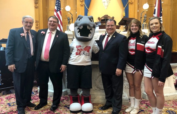 Muskingum University’s cheerleaders and mascot, Magnus, joined other mascots and cheer squads from around the state to help spread awareness of school spirit, pride, and diversity at the Ohio Statehouse in conjunction with the Association of Independent Colleges and Universities of Ohio (AICUO) Mascot Day on Wednesday. Magnus was welcomed and recognized in both the House and Senate chambers during Legislative Session on Wednesday, October 23rd.